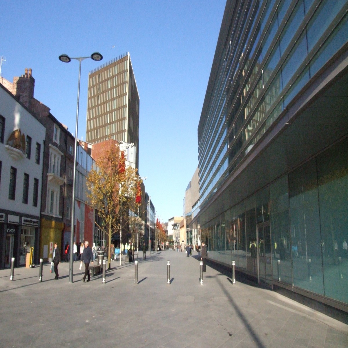 Among the first elements to be completed within the development were Fairgate's transport interchange, car park and pedestrian link bridge to the southern end of the site. These provide the logistical anchor to the development, their design helping to reinforce new routes between the riverfront and the heart of Paradise Street, with the spaces between each building in the composition becoming almost as important as the volumes themselves. The car park design is refined to the simplest and most efficient of layouts: a stack of orthogonal parking floor plates with pedestrian bridge, ramps, lifts and other services plugged into the façades. The movement of vehicles and pedestrians inside is celebrated with the addition of a translucent fibreglass screen to the west elevation. Nearby, the bus station is signalled by two elegantly twisting, timber-lined canopies that geometrically reference the shape of a ship's hull in response to the location, which is on the site of the original Liverpool Old Dock.